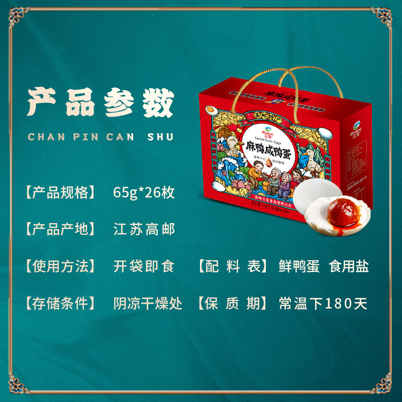 • 商品名称:咸鸭蛋高邮正宗鸭蛋65g*26只红心流油圭级咸淡